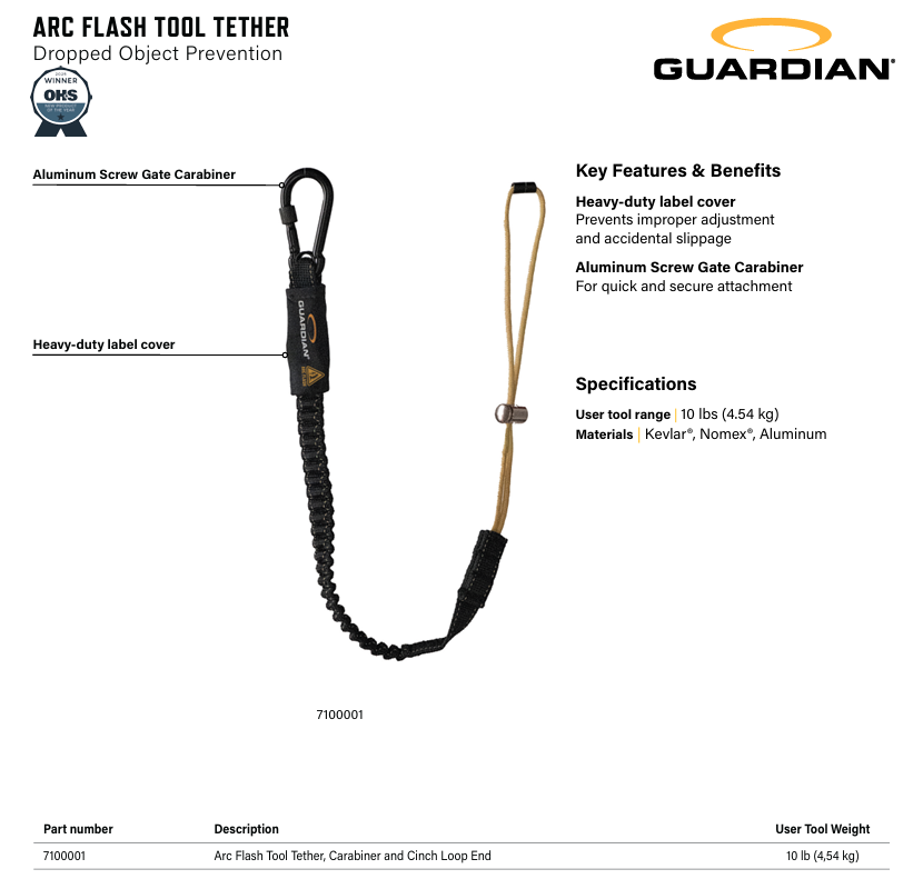 Guardian's ASTM F887 Arc Flash resistant bungee-style tool tether securely anchors your tools while minimizing entanglement risk by shortening their length when stored. Made from a Kevlar/Nomex blend, it provides superior heat and burn resistance than regular nylon or polyester options, allowing your tools to stay tethered, and workers below safe, even in the harshest conditions.