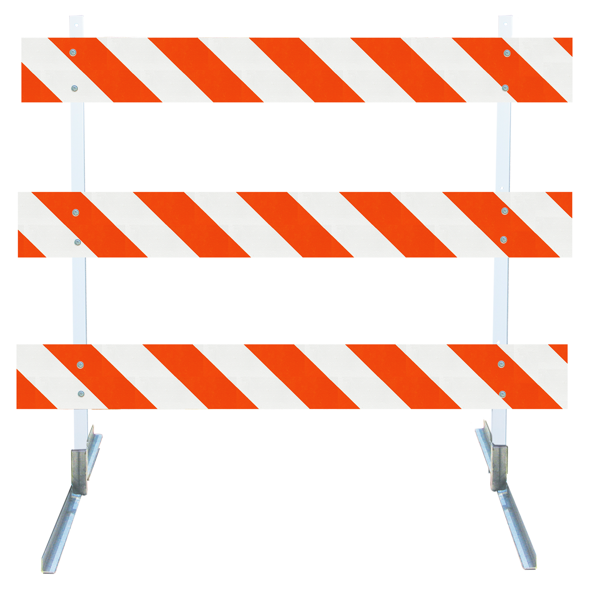 Use power post with galvanized steel square tube feet (14 ga) or angle iron feet (10 ga). Order sheeting on one or both sides of the boards, or none. 3M retroreflective striped sheeting available in engineer grade, high intensity prismatic grade, and diamond grade. Chevron sheeting is also available.