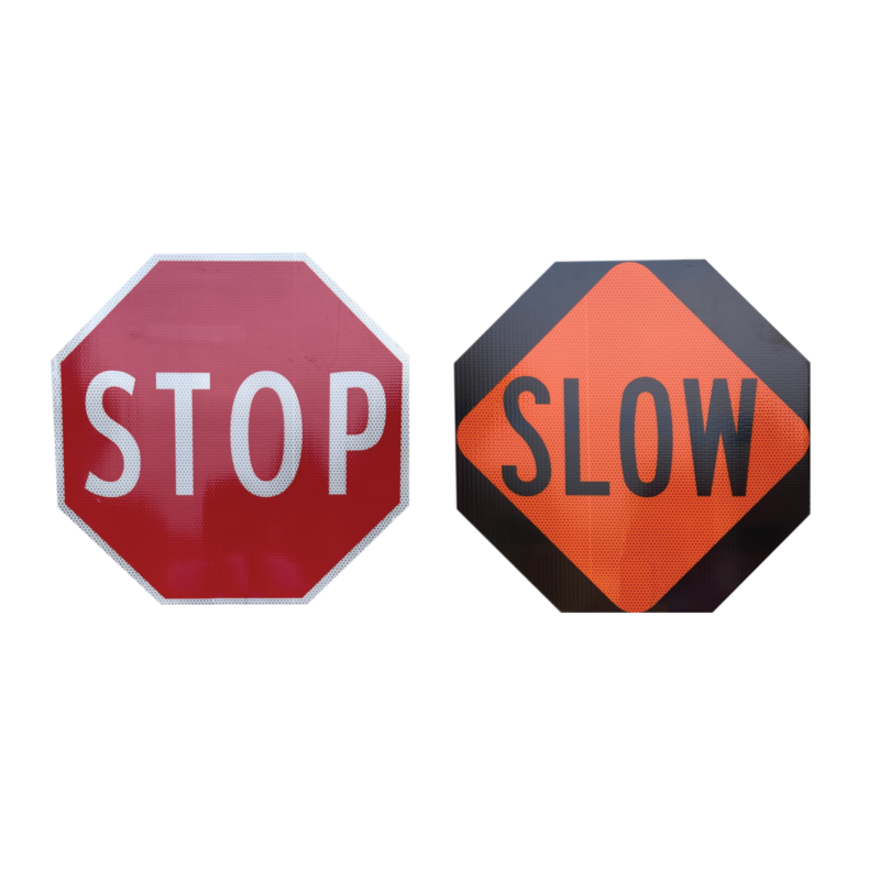 Two sided 18 in and 24 in STOP/SLOW signs for paddles. To replace the sign, rivets need to be drilled out and replaced with machine screws to attach a new sign.